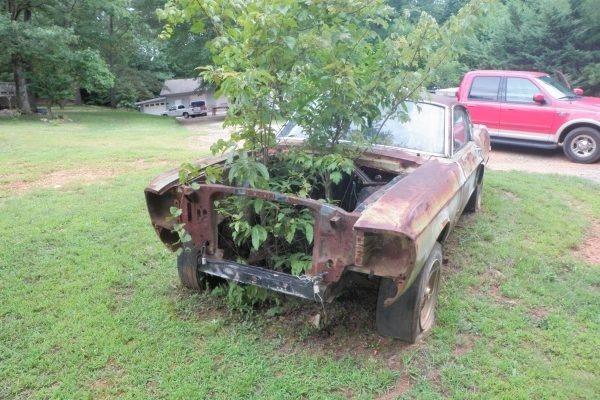 FROM 7/18/2012 – When we opened this submission from fellow barn finder James, what we saw was not what we were expecting. We’ve seen plenty of cars and trucks with trees sprouting from them, but never have we seen such a sad sight as this. James believes this car to be a real 1967 Shelby GT500 and he and his father have known about this car since he was a kid.