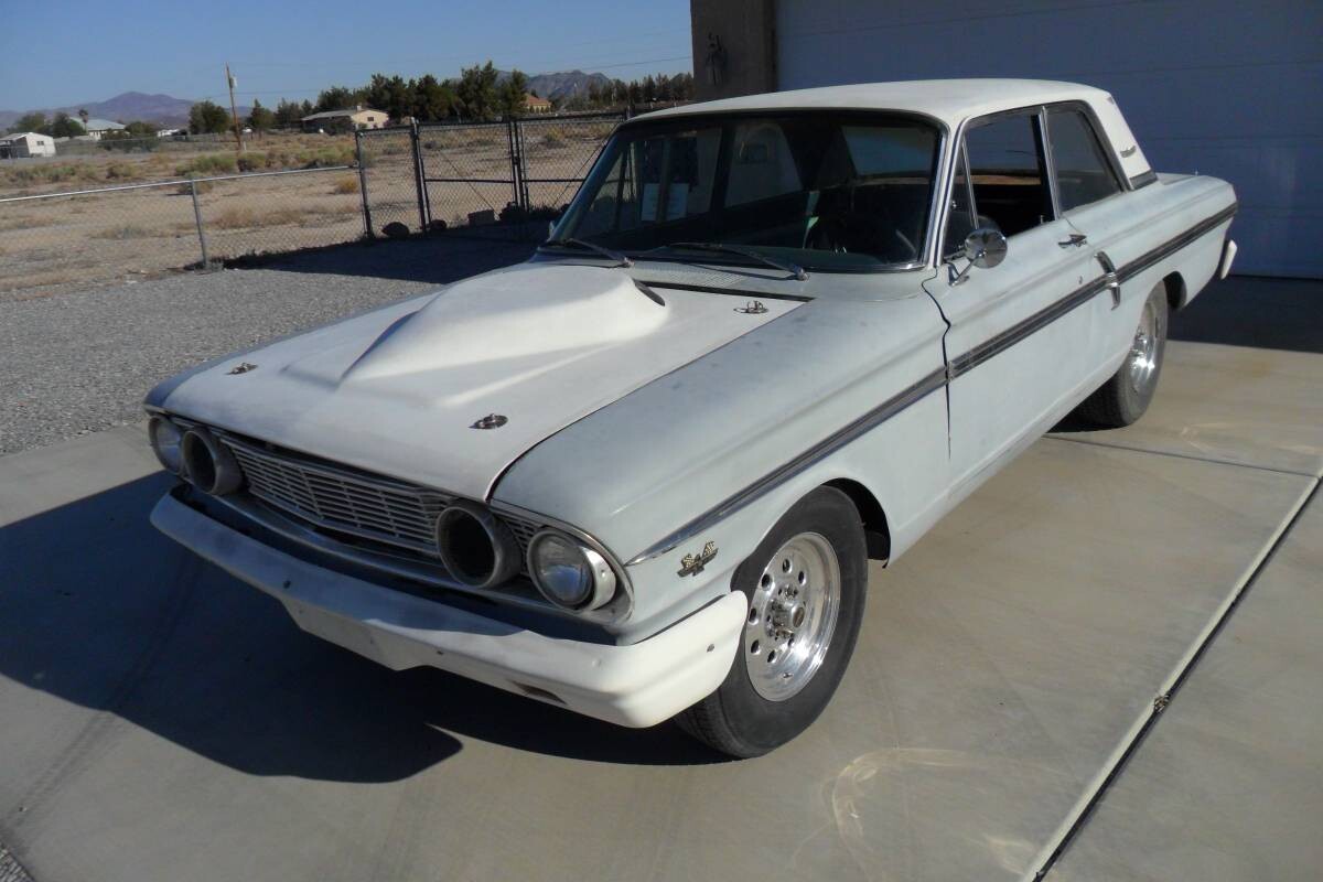 This 1964 Fairlane is a 2-door sedan with 500 model trim. It has a 427 V8 with a side oiler and a high-rise manifold with twin 4-barrel carburetors. Fiberglass hood, trunk lid, front fenders, door skins, and both bumpers are part of the package. Plus, the battery has been shifted to the trunk. So, is it a Thunderbolt or a wannabe? The Thunderbolt was a factory experimental drag car that would be a one-year wonder and have all these characteristics.