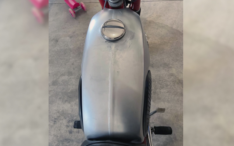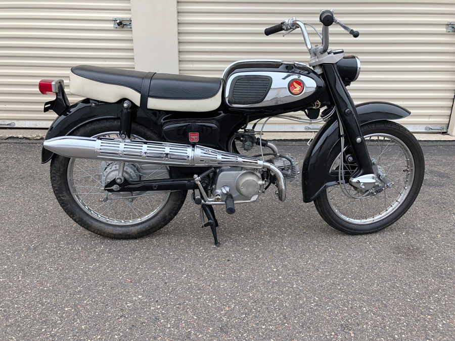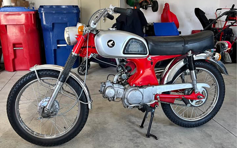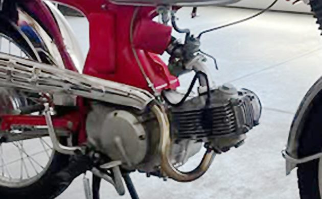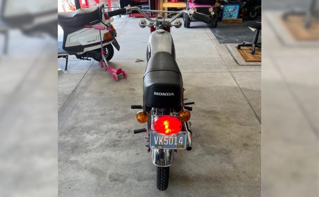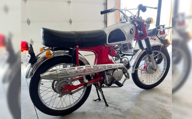 There wasn’t an engine photo; my apologies for the zoomed-in photo above. This is Honda’s 89-cc OHC four-stroke single-cylinder, which had 8 horsepower, and it sends that power through a 4-speed transmission to the rear wheel via a chain, as you already know. The seller says it starts on the first or second kick, which isn’t surprising, and there are no leaks. It has new tires, a new battery, a new chain, and a rebuilt carb. At $1,400, this is a good deal, even with the gas tank paint. Take it off and repaint it yourself and you’ll have a fun little bike for shows and riding around the neighborhood.