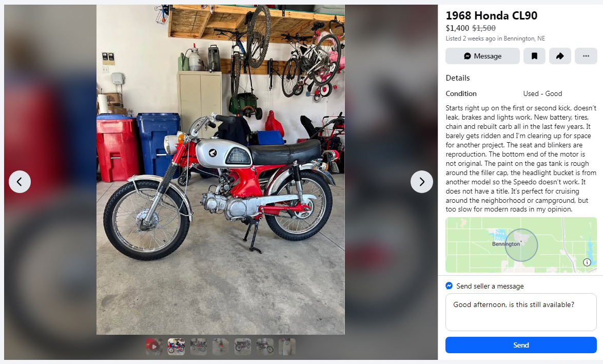 A tiddler motorcycle is generally thought of as most bikes under 125-cc or so, give or take. Some consider anything under a 250 to be a tiddler, but that’s not me. I love small motorcycles. This 1968 Honda CL90 is listed here on Facebook Marketplace in Bennington, Nebraska, and the seller is asking $1,400. Here is the original listing, and thanks to NW Iowa Kevin for the tiddler tip!