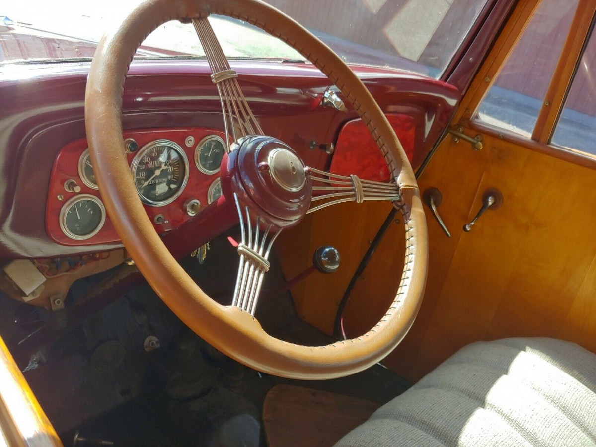 Finished in a combination of maroon and red, the Woody makes a positive first impression. It appears that the paint may sport a few chips and minor defects, but if considered as an above-average driver-grade car, it has no immediate needs. The panels look remarkably straight, and there’s no evidence or mention of any rust problems. The defining characteristic of any Woody is its timber, and it doesn’t let the side down in this case. Its fit and finish look excellent. There is no peeling varnish or signs of rot. The wire wheels wear red paint to match the fenders, and a set of trim rings add a classy touch. A bonus is the seller’s decision to include a spare set of wheels and good tires. The trim shines as impressively as the paint, and the glass looks flawless.