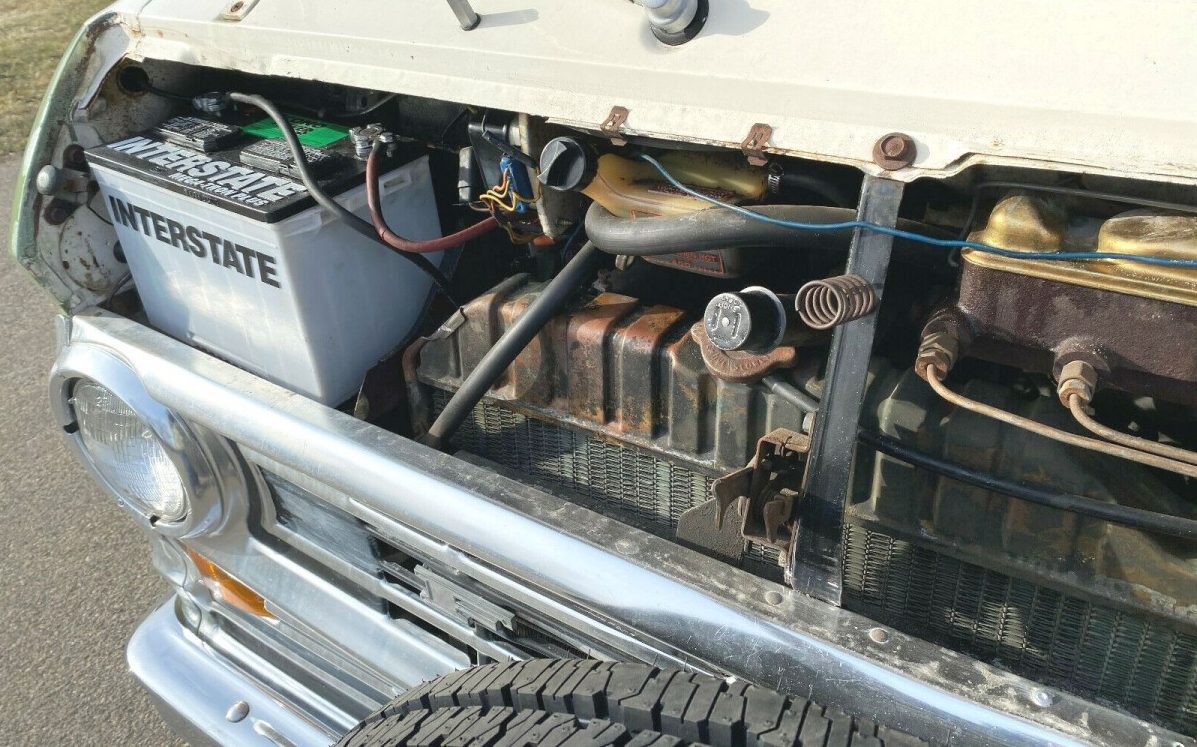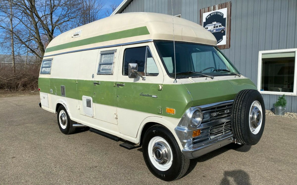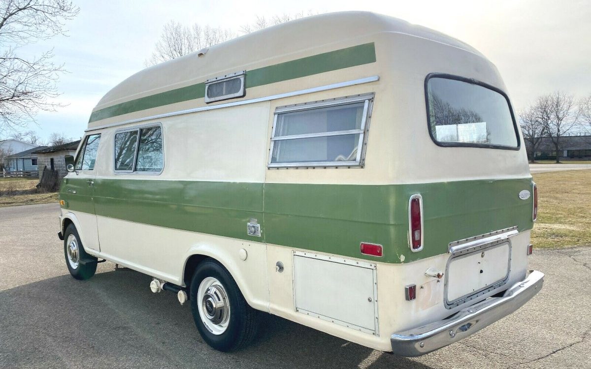 The 302 cid (5.0L) Ford V8 resides in there somewhere. It may seem a little small for a lifetime of carrying a small house on its back, but a host of vacationers towed trailers or drove campers with small V8s making in the area of 200 HP and 300 lb-ft of torque back then. This camper will do fine on the highway even if uphill stretches are done (if you have any respect for yourself or humanity) in the slow lane.