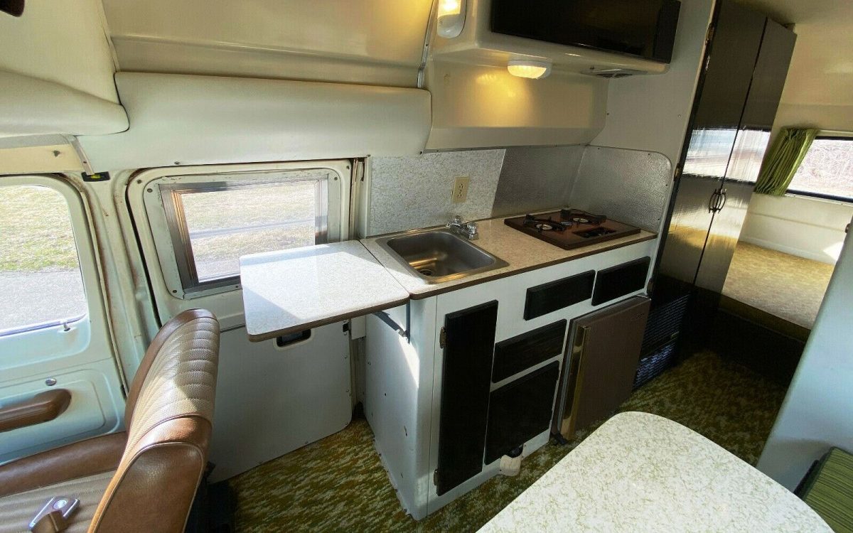 Equipment includes updated electronics and USB charging ports, propane stove, furnace, and water heater, 12 volt refrigerator and water pump, and tanks for fresh water, black water, and gray water. The Ford van apparently came with a tan interior that was mated to the green camper body. Fifteen years from now a new $50,000 camper van will probably sell for $8000, but this one’s value may actually increase over time. Would you consider a vacation in this ’70s Xplorer?