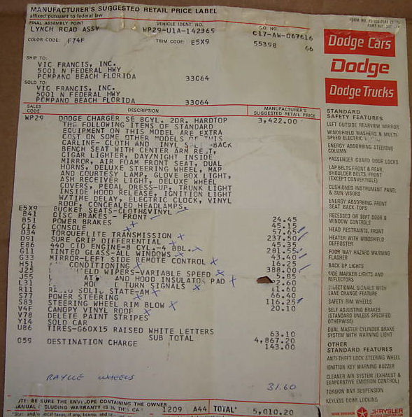 I found this window sticker of a similar 1971 model with similar equipment. http://www.kiphuth.com/images/charger/wp29u1a142369_ws_1.jpg