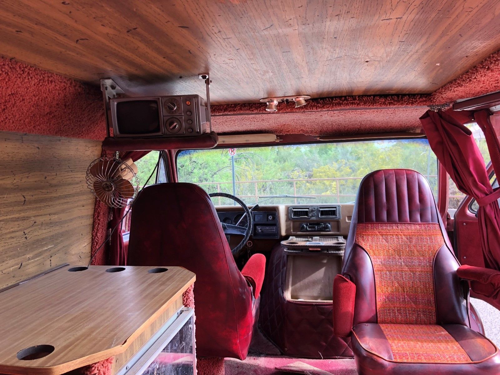 Everything in this GMC is either wood paneling, or shag carpet–just the way it should be! The captain’s chairs have funky insert patterns and fuzzy armrest covers. It even has a small television, not to mention aftermarket period air conditioning (plus that neat little wall-mounted fan). According to the ad, the minifridge uses blocks of ice to keep things cool.