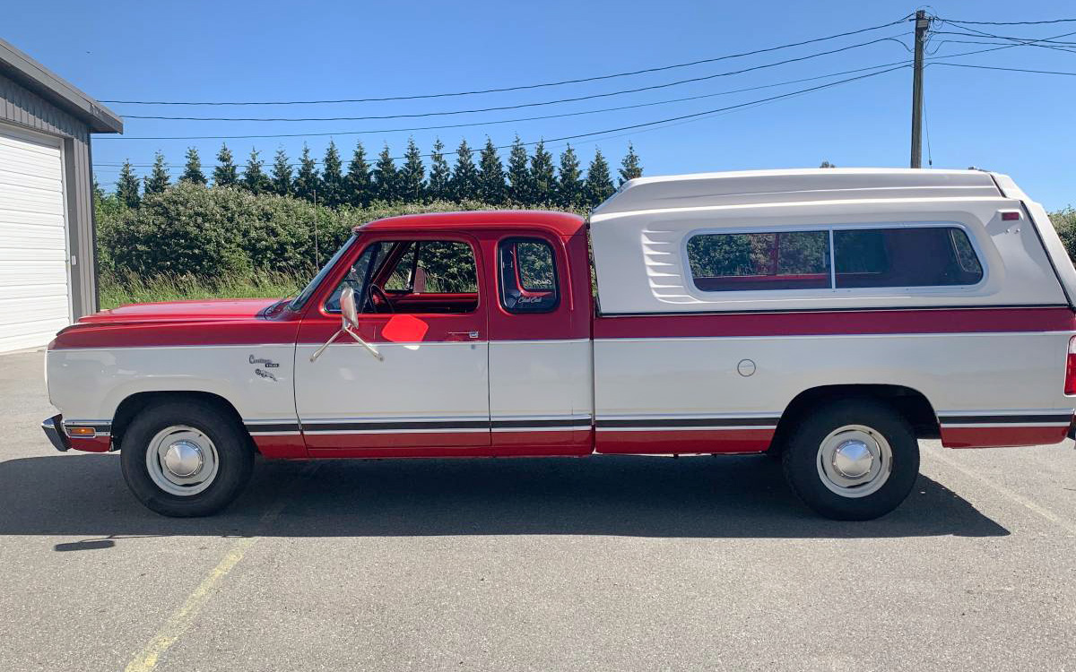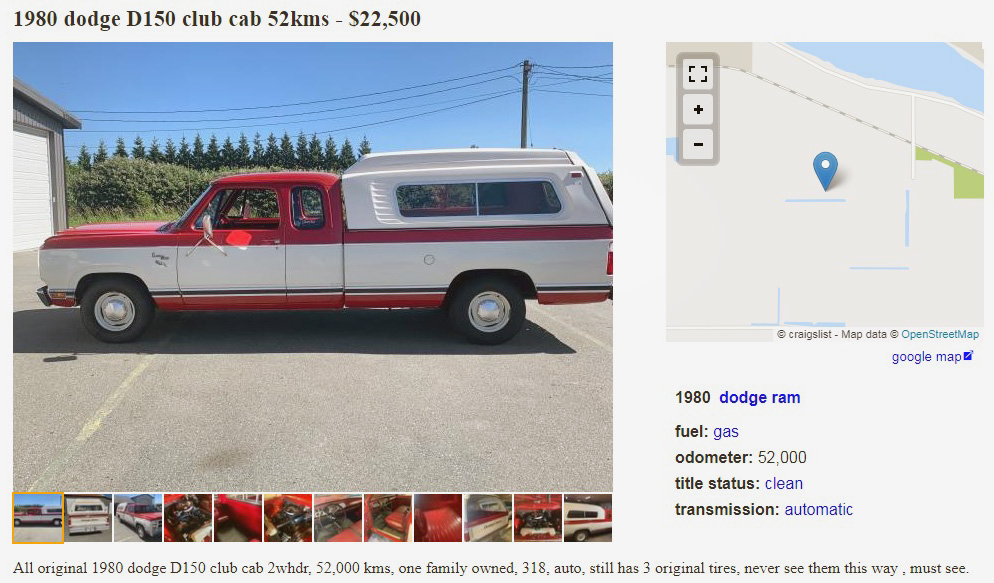 A beautiful example of Impact Red and White, in what Dodge referred to as the “PXS Paint Procedure” two-tone color scheme, this 1980 Dodge D150 Custom Club Cab has a mere 52,000 km (32,311 miles) on it after having been on the earth for over 45 years. This time capsule can be found here on craigslist in Vancouver, British Columbia, Canada, and they’re asking $22,500 (presumably Canadian dollars, or $16,330 U.S. dollars). Here is the original listing, and thanks to Curvette for the tip!