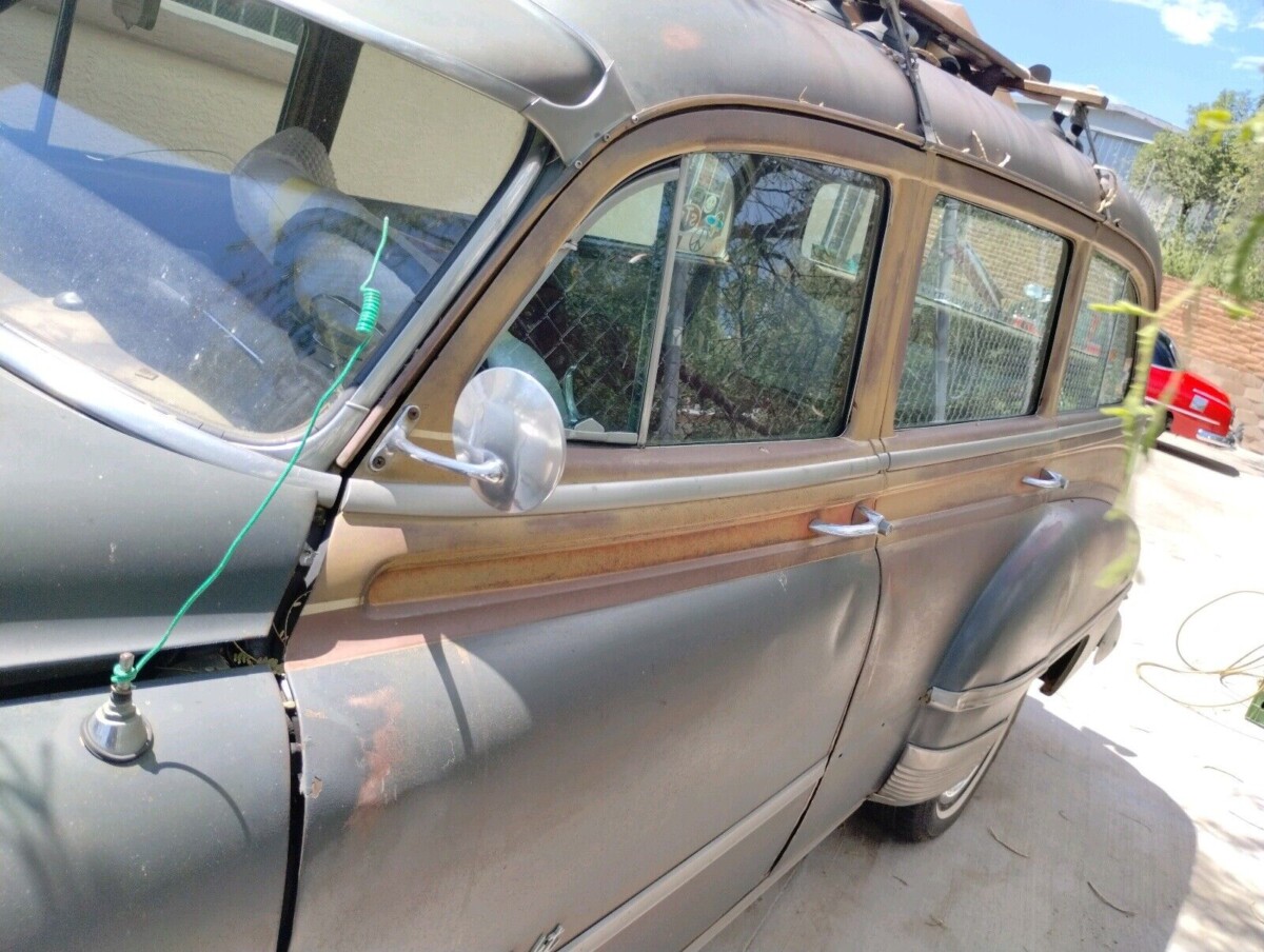The body on this Pontiac isn’t bad for being 72 years old. Each of the four doors has some wood trim, harking to the Woodie era of station wagons that was on the way out in the early 1950s. These transports were sometimes referred to as “tin wood wagons.” If you don’t repaint it, perhaps a layer of clear coat could help preserve what’s left. The interior has had some attention in terms of upholstery that replicates how the wagon left the factory. But the to-do list will need to include carpeting and a headliner. The glass has been replaced except for the windshield.