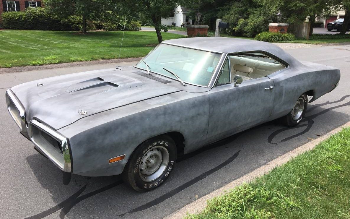 The seller states that this car is running, but that it is in need of restoration. Obviously the restoration on the outside of this Dodge has been commenced, but we have no real idea what has been done under that grey primer. It all appears to be quite straight but there are a few imperfections that would need investigating and addressing before you proceeded any further. There appears to be a couple of small imperfections on the hood that indicate that preparation may not have been perfect. The car was originally finished in B5 Bright Blue Metallic, which would have looked stunning. It doesn’t appear that the front or rear glass has been removed during the work to date, so that may also need checking. There are a number of shots of the underside of the car and it does looks to be solid underneath but once again only a close inspection will confirm this. The rear trim around the tail-lights also appears to be wrong given that it carries an R/T badge, and the way that it has been attached to the car is a pretty unsightly job. That R/T badge also calls attention to the fact that this Dodge appears to be missing the very distinctive Super Bee badges.