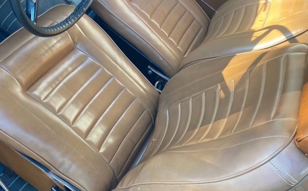 The saddle-colored interior looks great with what’s left of the dark green paint. There isn’t a good “overall” picture of the interior in the advertisement, but the variety of close-ups indicate that the upholstery, dashboard, and headliner have held up very well.