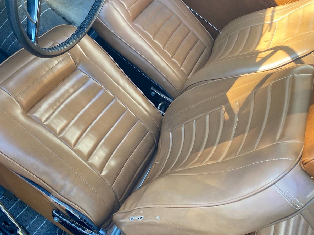 The saddle-colored interior looks great with what’s left of the dark green paint. There isn’t a good “overall” picture of the interior in the advertisement, but the variety of close-ups indicate that the upholstery, dashboard, and headliner have held up very well.