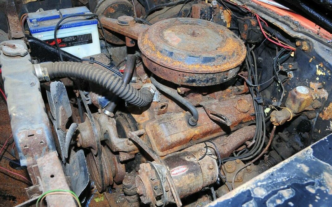 It is a builder and someone will. Looks like a later v-8, guessing a 350, based on valve covers and air cleaner. I don’t know why the author would suggest that the forces of nature that caused the skin to rust OFF the inner door would leave the rocker intact. . . . It needs everything, but is doable.