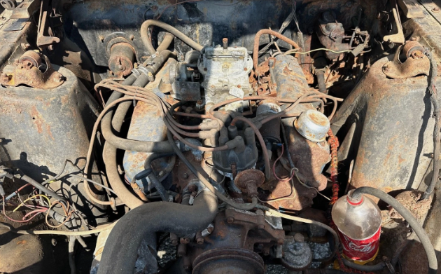 So sad to see something like this. What was once something nice to have is now just a piece of rusted junk. In his most deep psychedelic trip, he might get $2K for it. Ten times that??? Never in his wildest dreams or trips.I still don’t know what to make of the interior. Whether the dash melted or just rotted away, it just looks scary! There is no floor inside, since I can see the steering column from the ground. I can’t even see this being something to start with, since everything needs replacing. Might just as well crush it and get something with about 500 pounds of rust less on it. You would have better luck than trying to restore this.
