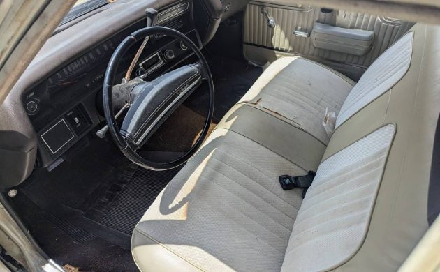 The exterior needs attention. There is rust that goes beyond the surface variety, and the beige paint has faded and has been touched up in places. But we’re told the undercarriage is clean. The car lacks wheel covers (though the seller has them stashed somewhere), which adds to the bad boy look the seller may have been going for. This could be a fun restoration project – unless four doors are too many to be cool at Cars & Coffee.
