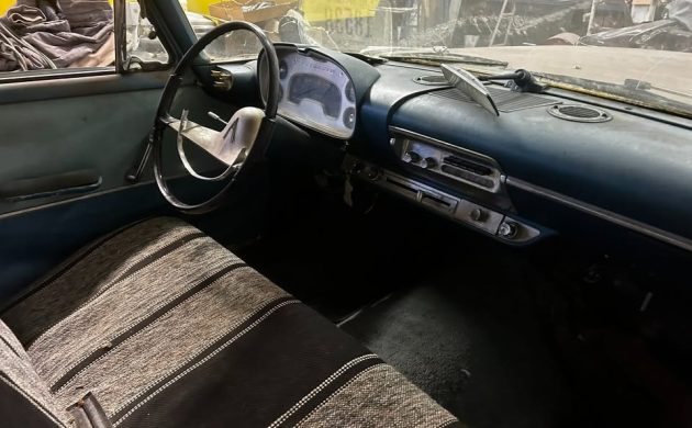 This Savoy may be wearing what could be its original Sky Blue paint, though loads of patina abound. And there is no color at all to the front clip suggesting it may have been changed out at some point. We’re told the machine is complete and ready to be restored unless you thought it would best serve as a donor for a model with entry points. The odometer reads 30,000 miles, but we’re betting its well on its second time around. Rust does not seem to be an issue, which it was for a lot of the 1957-59 Plymouths.