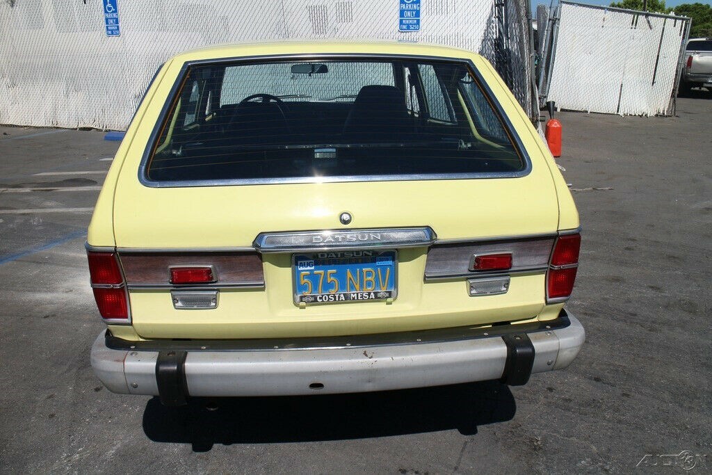 Check out the old-school California blue plates and vintage dealer plate frame – those are the details that only survive on time-warp cars that lived quiet lives with old ladies going to church and the market. The light woodgrain inserts are faded but amazingly still there, and lenses and glass all look perfectly fresh. The Datsun does run and drive, according to the seller.