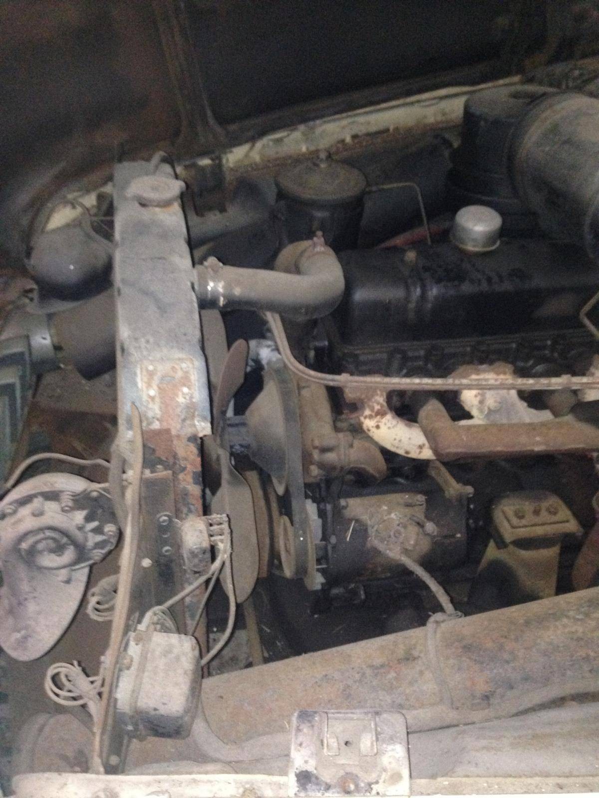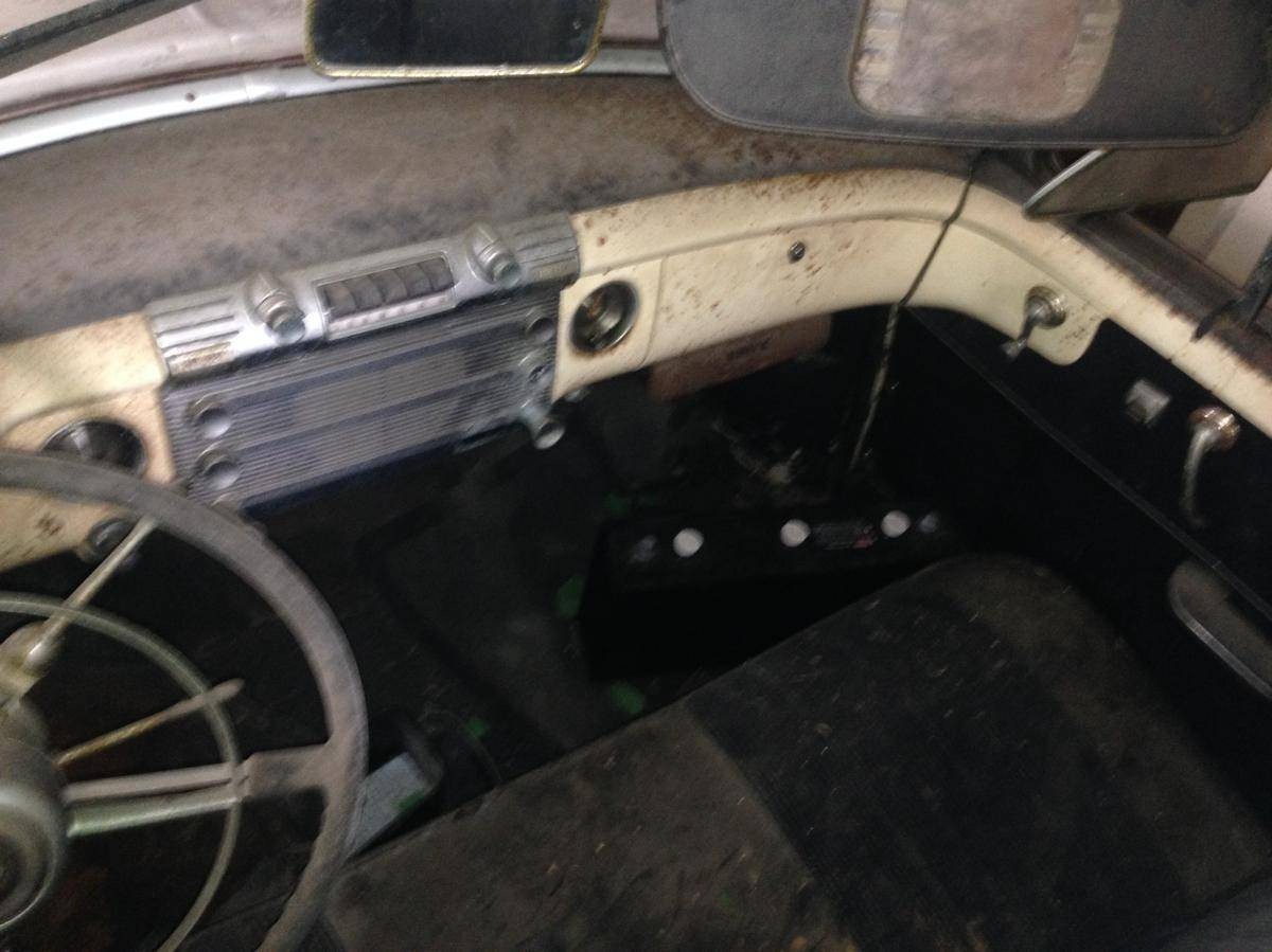 We can’t see much of the interior but what is visible looks like it is serviceable. The rear seat upholstery doesn’t look like it matches the front, but it could be down to just grungy seat covers. The radio and speaker grille look like a miniature jukebox set in the middle of the painted dashboard. The convertible top is stowed and no photos of it raised are provided.