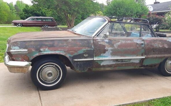 There was a time when you couldn’t have pitched a horseshoe without hitting a ’63 full-size Chevy – Impala or not. Heck, we even had one in our family for a few years. I was young at the time but I don’t recall my father ever kibbitzing about it. And there was a time in the late ’60s when one would encounter plenty of ’62, ’63, and ’64 Impalas that had been set up as street racing hot rods. In spite of their size/weight, they were plentiful, cheap, scored nice looks, and could be built to the hilt with a small block or a 409 W-Series engine – even newer rat motors sometimes made an appearance. Today’s find is clearly rough around the edges, but it is a convertible – that usually generates extra points even if the hi-po set generally eschewed that body style. Let’s give this drop-top the once-over, it’s located in Greensboro, North Carolina and is available, here on eBay for a current bid of $5,900 with the reserve not yet met.
