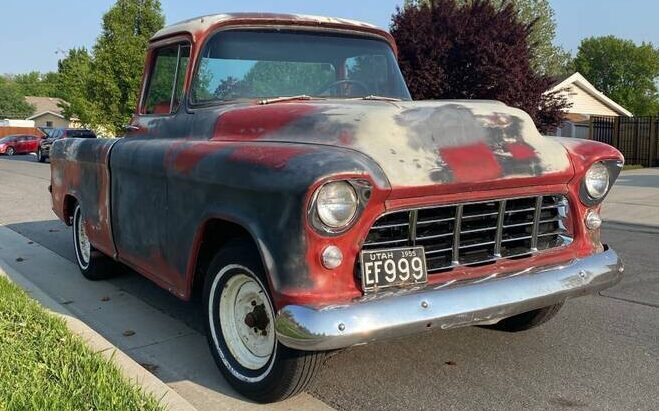 While not specifically stated, the interior’s bench seat appears to have been reupholstered in red vinyl at some point and it shows quite well. There’s no carpet on the floor now but that was a standard item in all Cameo trucks – an item not often found in a typical 1955 vintage pickup. The missing carpet reveals floors that are showing some scale but appear to be sound. While aftermarket gauges have been installed under the dash, it looks as if the original radio is still in place.