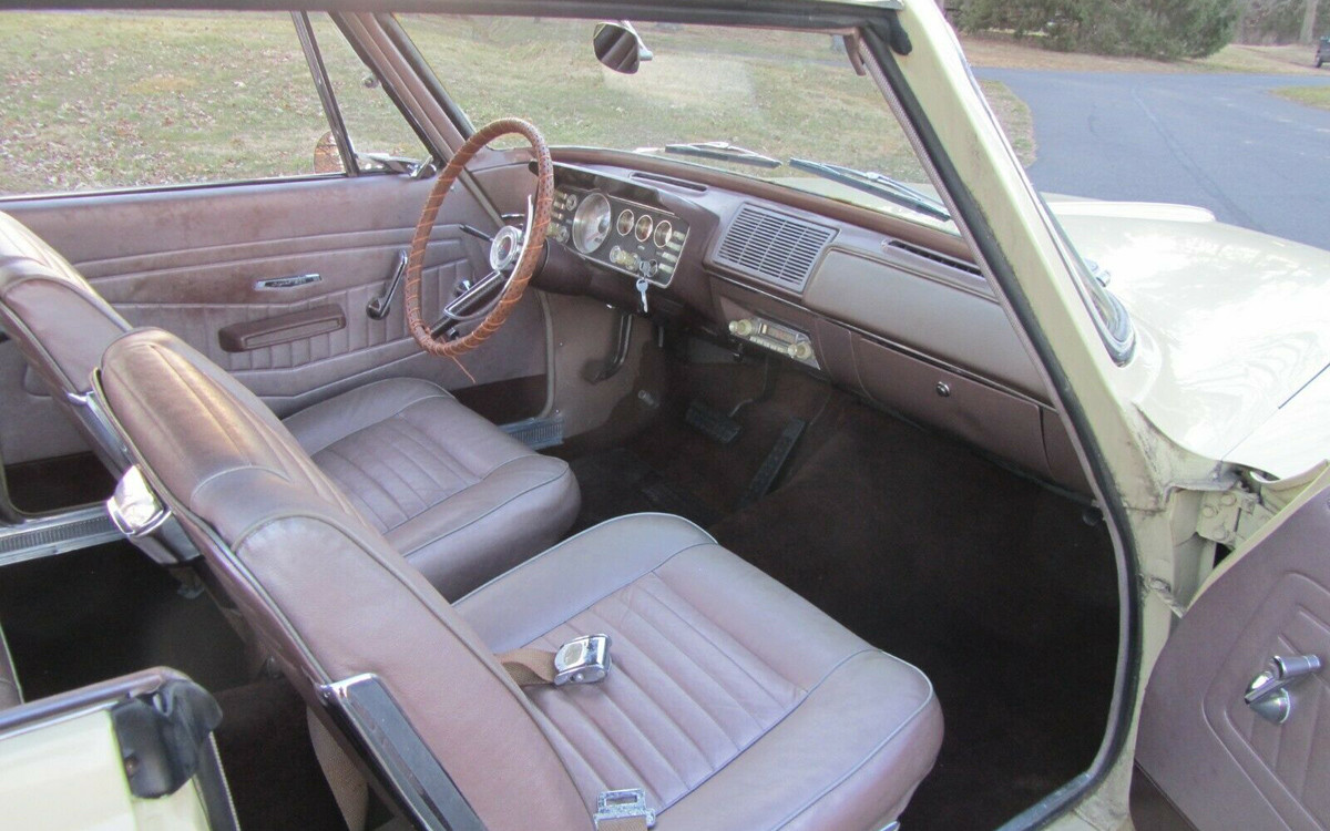 They say that this car was owned by two sisters from the Philadelphia area but nobody knows who painted it yellow. That’s unfortunate as it wouldn’t be inexpensive to bring it back to the original color. Or, a person could just live with it as a yellow car, worse things have happened, as we all know. There isn’t a photo from the driver’s door which is unfortunate because that’s where the push-buttons for the transmission would be. The interior looks great other than that indentation in the glove box door, I hope that isn’t from someone’s knee.