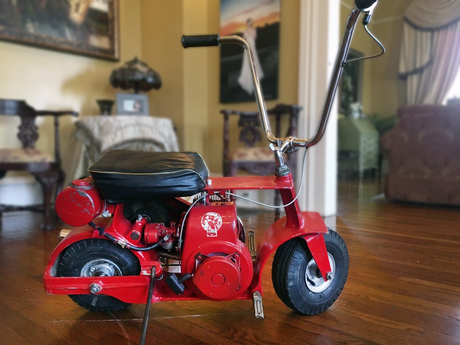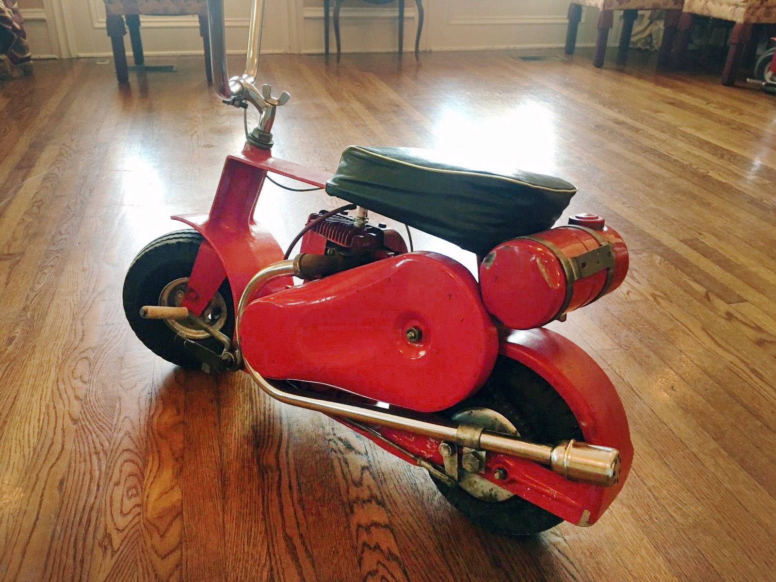 That little thing is too cool……I’d ride that around in the house….maybe chase the dog or cat just for fun… I remember having mini-bikes when I was 11-14. First one was probably homemade (not by me), and next a Fox mini that was the sharpest thing on wheels for a young biker-to-be… and somewhere along the way I was involved with one called a “Little Indian” I believe, that we managed to shoehorn a Yamaha 80cc engine onto… I only got it up to 55….it was too scary to go any faster but it would get up there as quick as you could go thru the gears and HANG ON! If you weren’t careful it would pull the front end up in any gear…way too much power for something that light. Who knows..