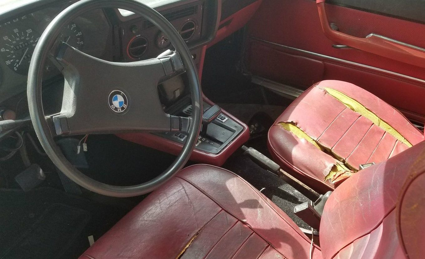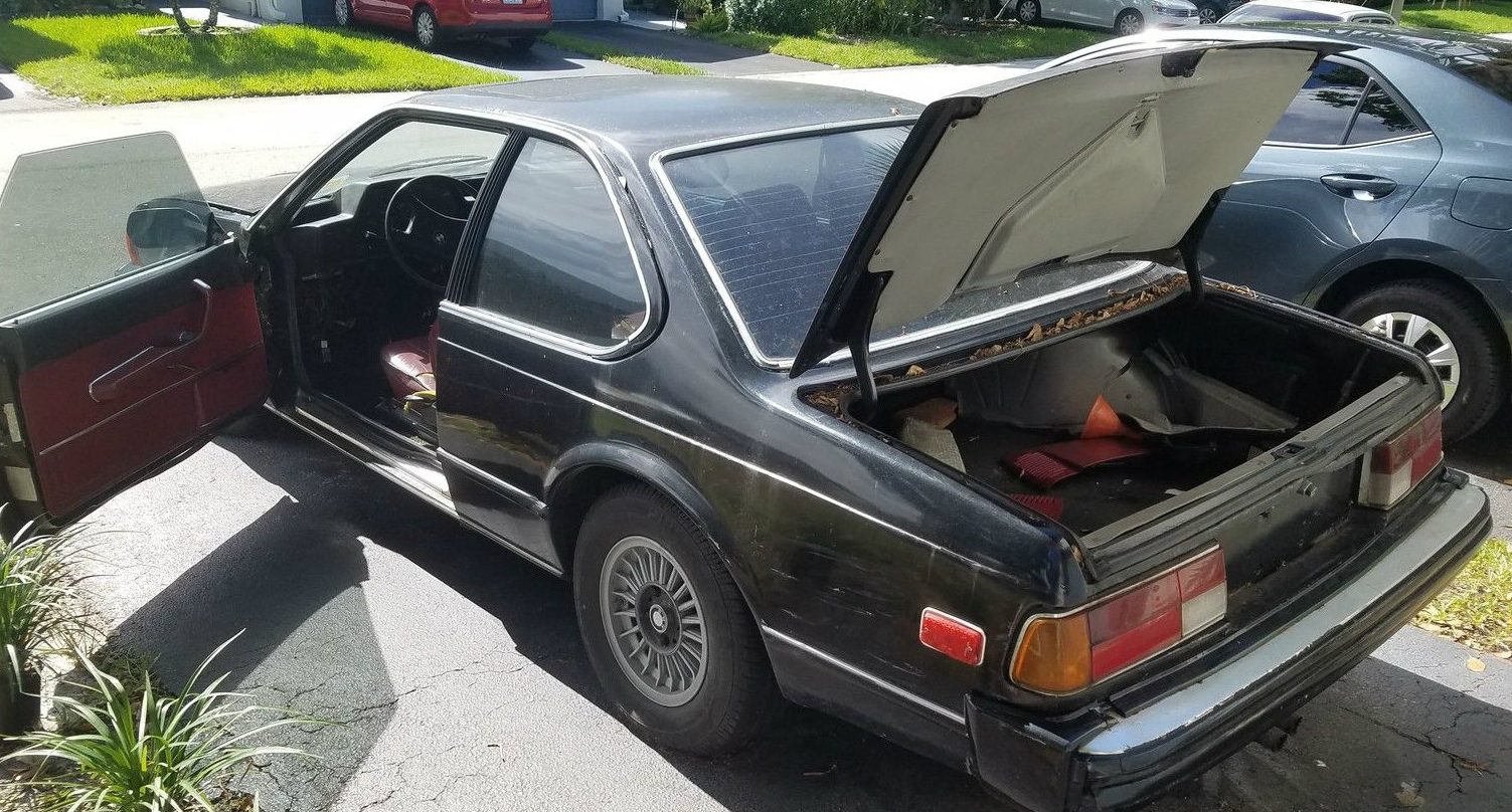 The car seen here apparently came from a tow yard in the Bronx, and is now parked in a driveway in Ft. Lauderdale. The seller claims he needs to sell the car to free up cash for a down payment on a house. Those stories are always a tad odd when the car in question could at most sell for under $2K, which doesn’t make much of a dent in a house down payment. Aside from that, the 6-Series’ interior is in fair condition with desirable cherry leather that is unfortunately looking quite tired. The kick panel underneath the steering column is missing as well.