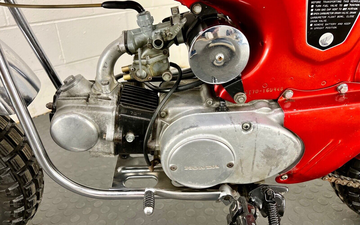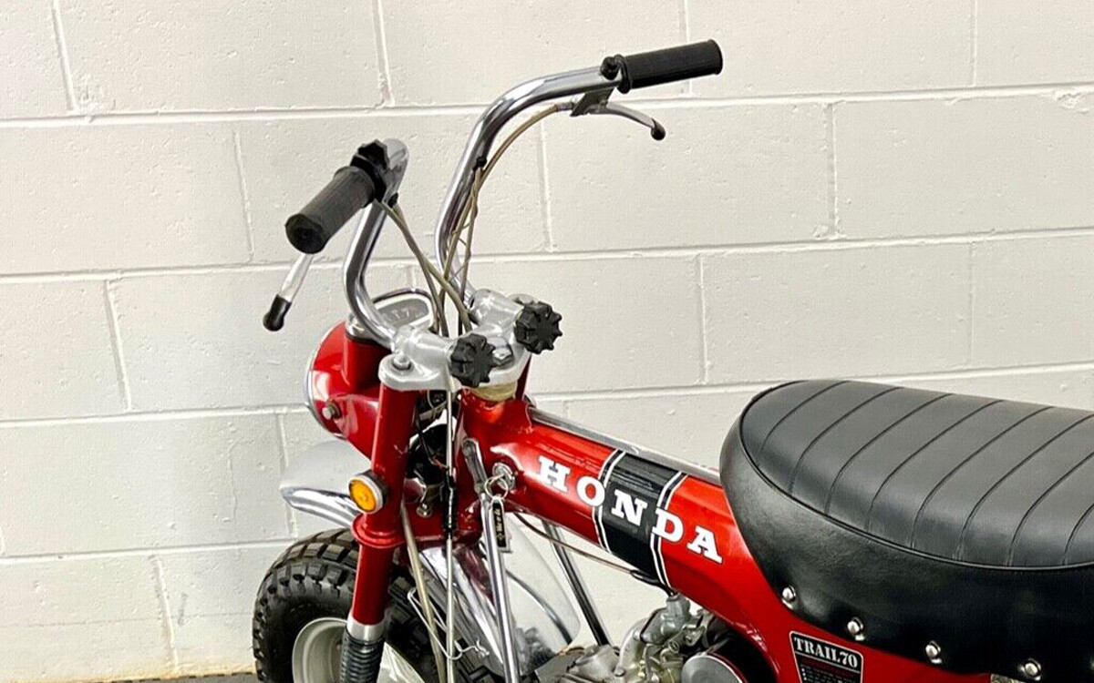 The 1969 through 1971 Honda CT70 K0 – the model with a three-speed automatic clutch – came in Candy Sapphire, Candy Gold, or Candy Red as with this example. The handlebars fold down so they can be hefted into the back of a car trunk or station wagon and brought to a trail somewhere. Although in some states they are street legal, so I’d just ride it if the trails were close.