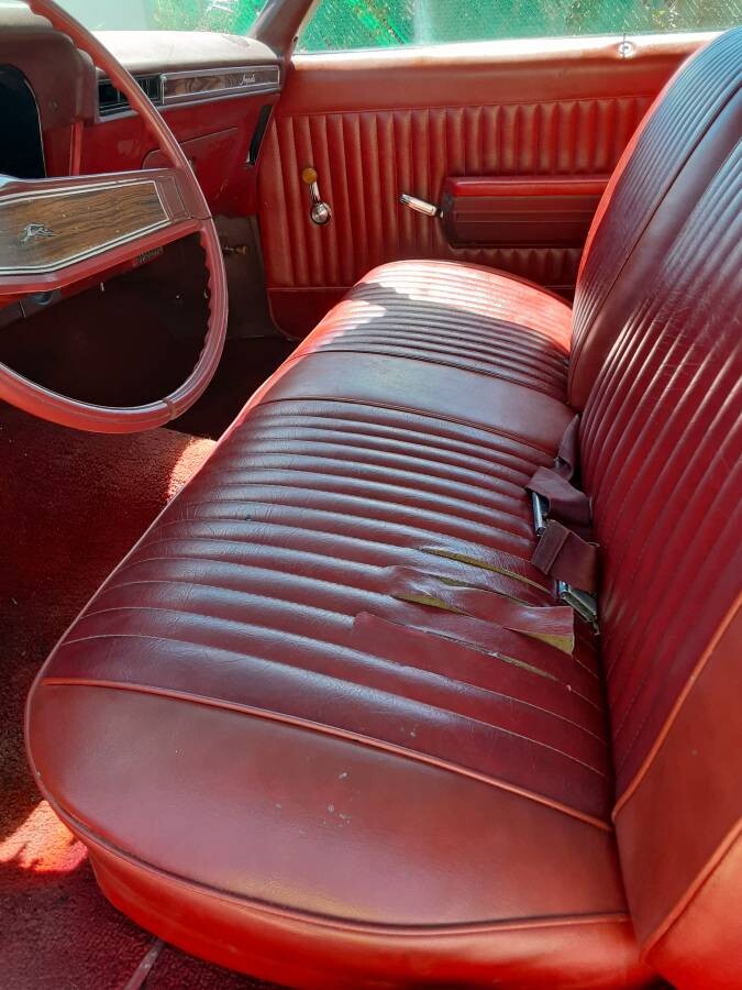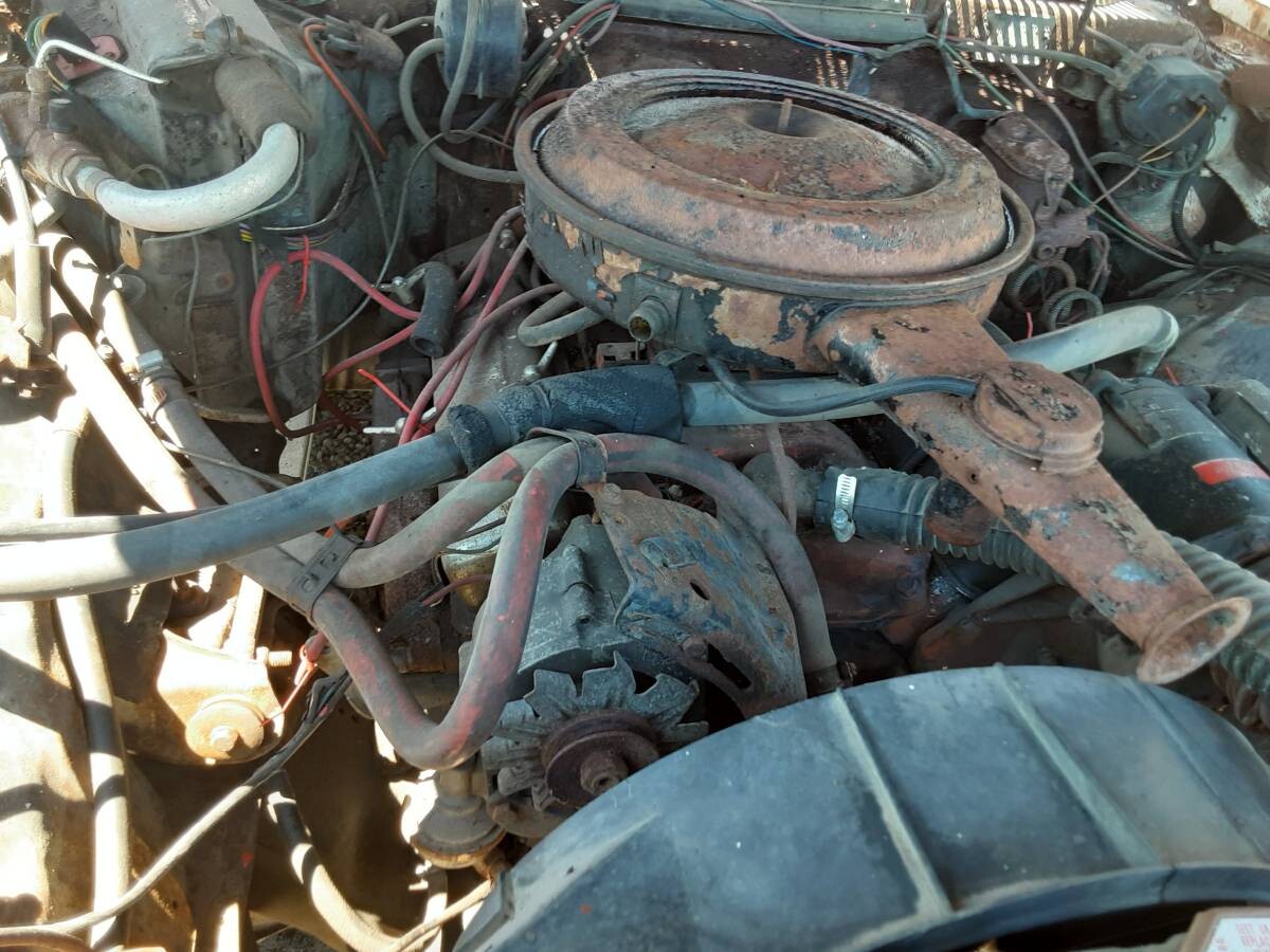 Hmmm. As evidenced by the red cloth top, custom door panels, missing body side moldings, and larger radius wheel wells – this had large diameter wheels & tires installed at one time. Someone’s abandoned dream – or nightmare.