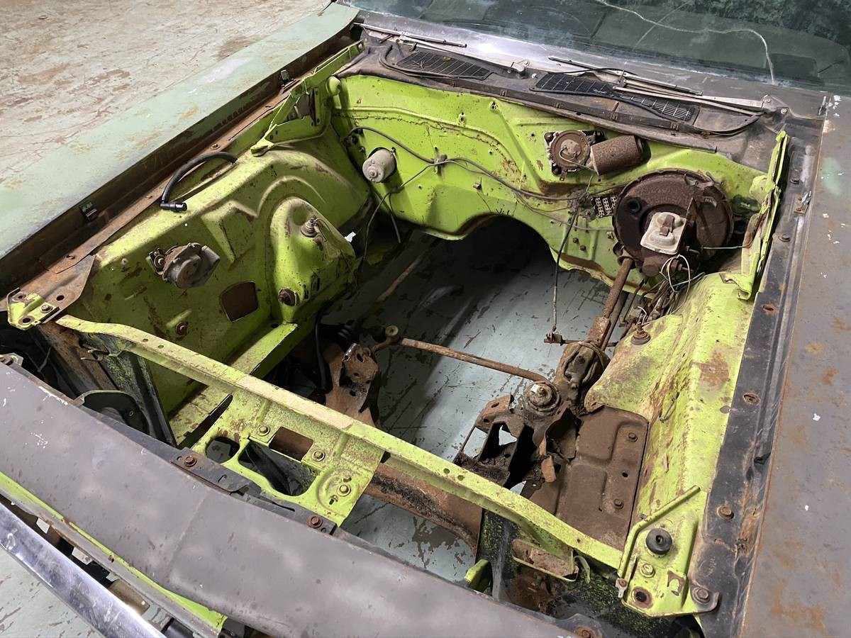 The car wore one of Plymouth’s Hi-Impact colors when it left the factory, FJ5 Limelight (called Sublime at Dodge). But it looks as though another hue of green was applied in later years. The body looks a bit rough, but we don’t note any see-through corrosion, just a lot of surface rust underneath, on the floorboards and there is some trying to brew around the rear window. The seller says the car comes with the A21 Elastomeric front bumper, but the photos show a regular Barracuda bumper that sits somewhat askew. The hood and rear spoiler are reproduction, not factory.