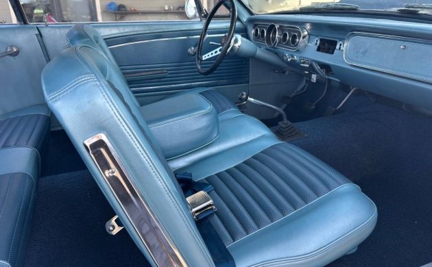 This baby blue Mustang has a partially restored interior, with the only example possibly being the absence of a radio. And the steering wheel is not stock, but finding one of those shouldn’t be too hard. The rear bumper seems to be MIA, and there’s no reference to one, so you may have to source one, as well. The hood appears to have been replaced for reasons not mentioned, but if you’re planning on a repaint, that shouldn’t matter.