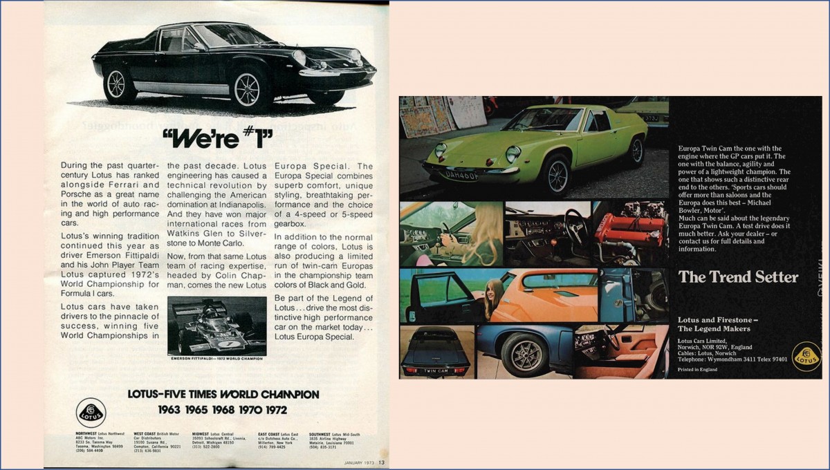 As you can see from these two period ads for the Europa, Lotus made a big deal about the Formula 1 connection. One item of note in the ad on the left is that the Europa was available with both a four-speed and five-speed gearbox. That’s an odd option for any car, don’t you think?