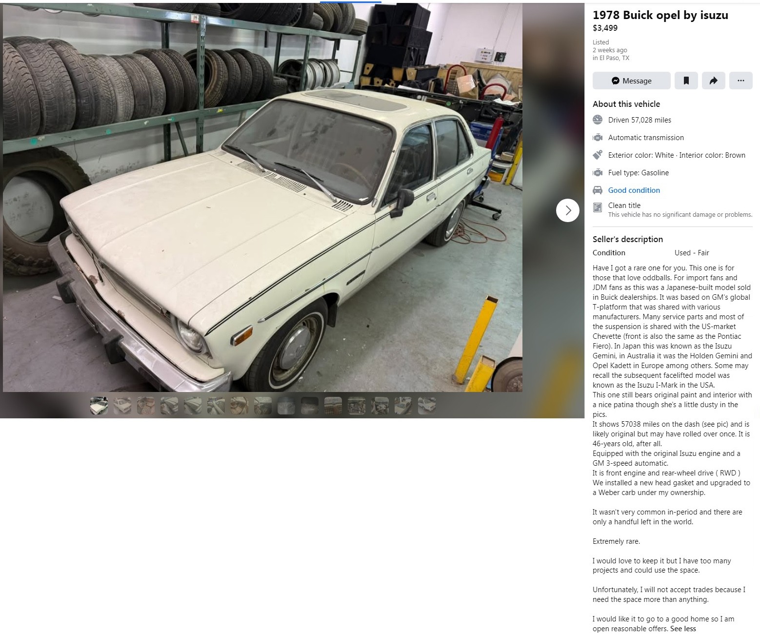 How can a car be from three countries? It’s hard to believe and even harder to explain, but this is the case with this interesting dusty little survivor sedan. This 1978 Buick Opel by Isuzu is listed here on Facebook Marketplace in one of my favorite cities in America: El Paso, Texas. They’re asking $3,499 or offer for this tri-country sedan, and here is the original listing.