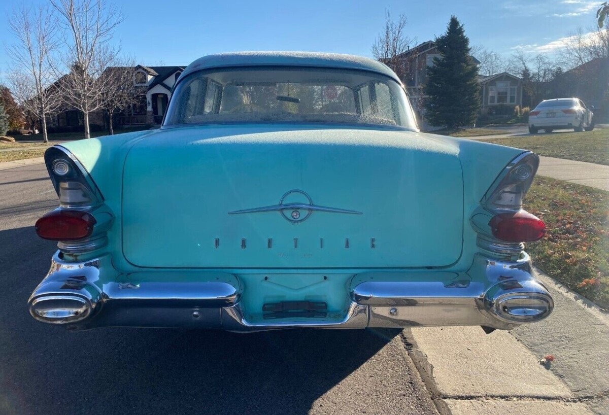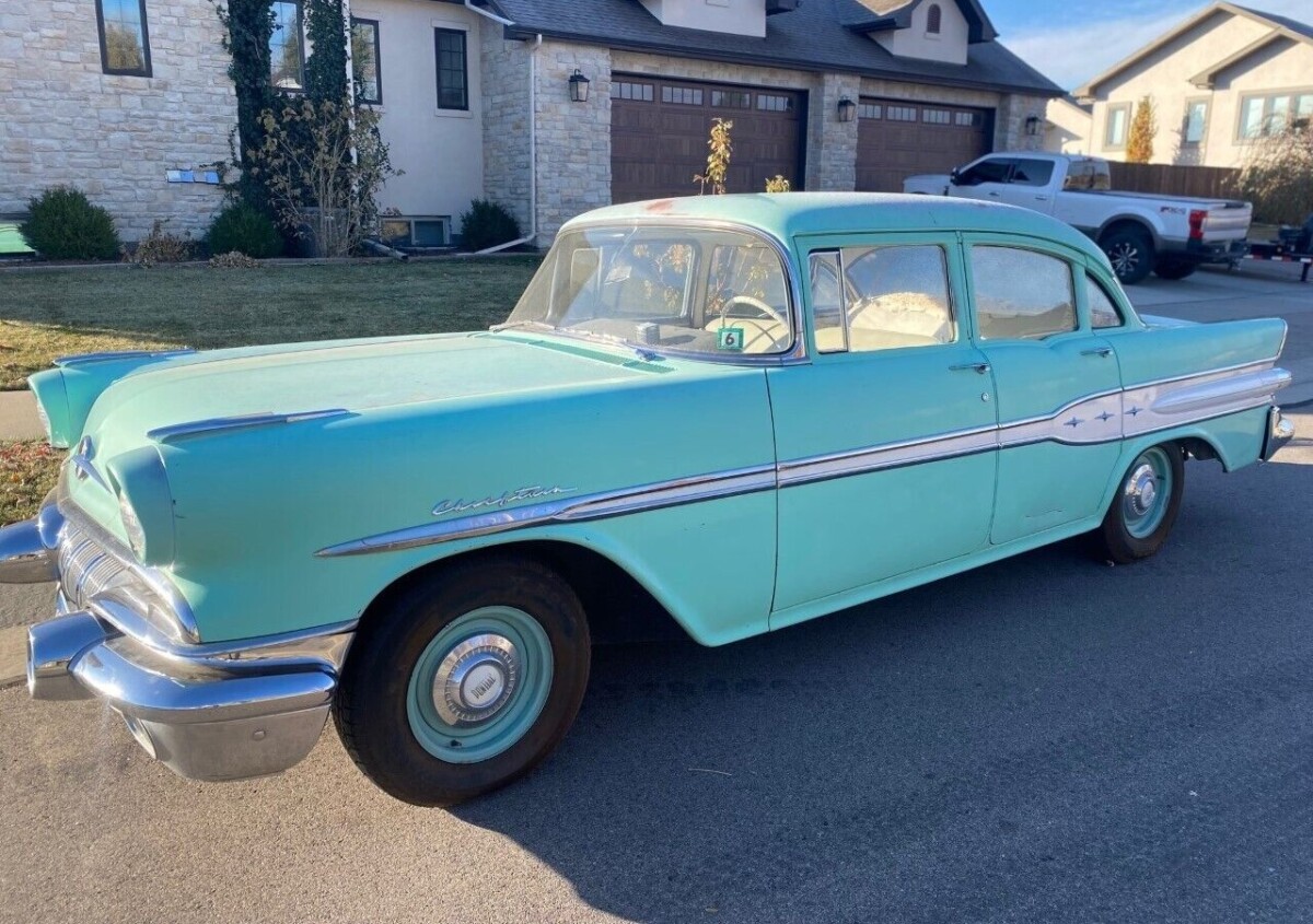Overall Pontiac production was 343,000 automobiles vs. nearly 1.4 million Chevies in 1957. So, nice Pontiacs of this vintage are harder to find today than their GM cousins. A Chieftain 4-door sedan like the one pictured here was one of about 35,000 assembled. The seller imparts little about what this ’57 Chieftain has been up to for the past 66 years. We’re told it’s original from head to toe, but that’s an often-overworked word. The body and aqua paint look sound, and the matching interior may be okay although a good cleaning and upholstery repair is advised.
