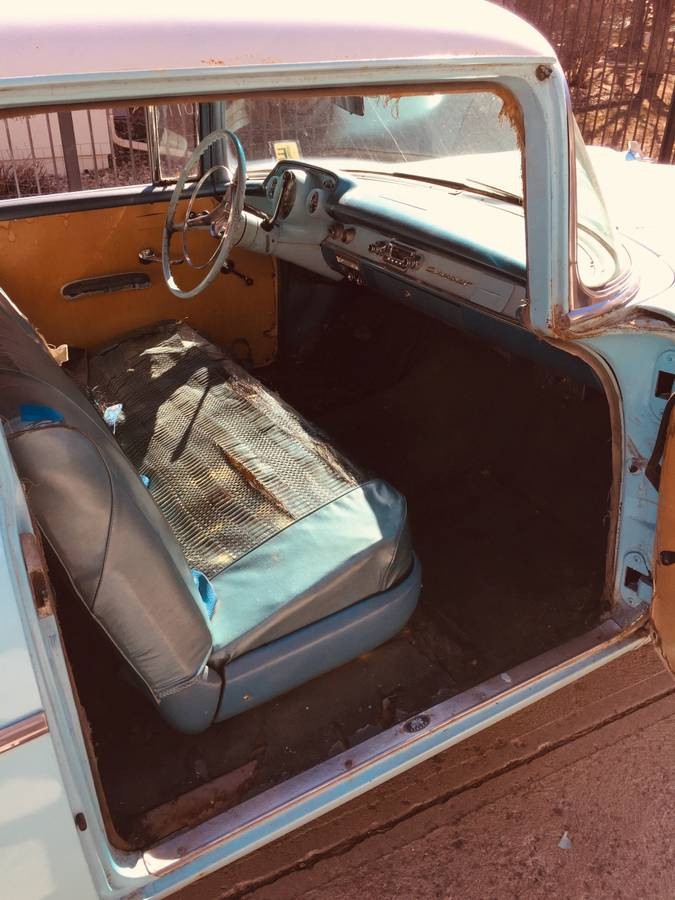This single-family 210 is wearing Imperial Ivory over Tropical Turquoise, likely its original colors but an older repaint as you can see some overspray on the VIN tag. The body looks good with no immediate signs of rust (except some surface stuff in the trunk) and the paint is wearing thin on the hood and trunk lid. The chrome bumpers and trim seem to have held up well as has all the glass. The original interior has recently been replaced and “before and after” photos are provided showing that a good job was done.