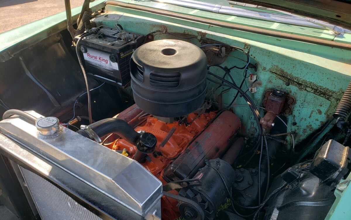 The body looks straight, and the India Ivory over Pinecrest Green paint looks okay for an older respray but could use some polishing and there are a few nicks. The chrome pieces look okay all around, and we’re told the floor and trunk pans are in good condition. The interior, which may be original, is fine with a few exceptions, such as the armrests being cracked.