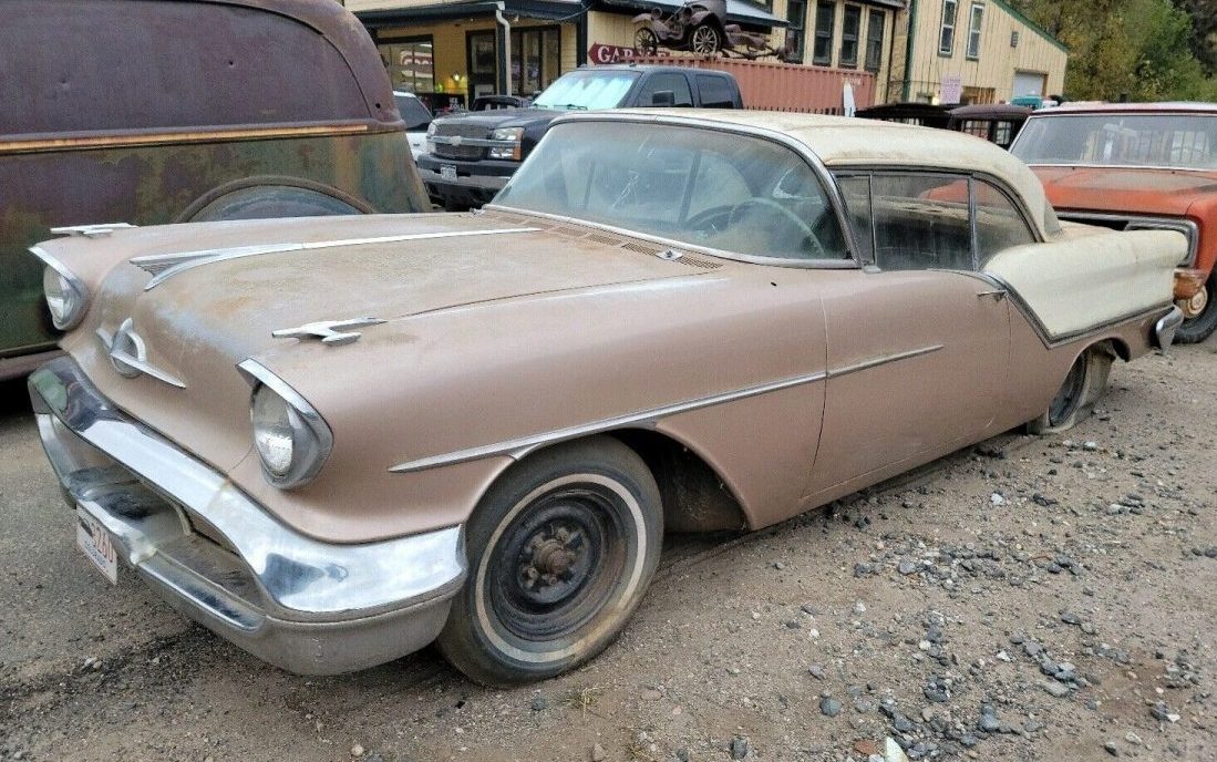 When you talk about cars from the mid-fifties, no one can deny that the Tri-Five Chevies are often the first to be thought of! However, Chevrolet’s companion make Oldsmobile also had some successful models with elaborate chrome trim, multiple paint colors, and significant performance. One example would be this 1957 Olds 88, currently for sale here on eBay. It’s located in Silver Plume, Colorado, with a current bid of $3,000.