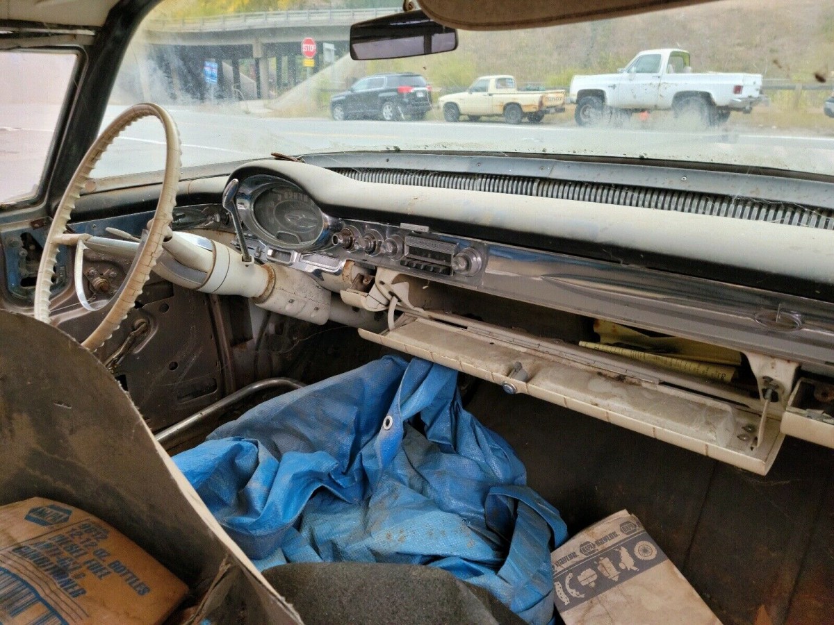 The styling of these Oldsmobiles may have been a bit more understated compared to other models of the mid-to-late-fifties, but there is still quite a bit going on. The dip under the side windows add some visual interest, and the expansive glass makes for an open airy feel. There are huge chrome bumpers front and back that look to be in good condition, save for a small dent above the rear license plate. Take a look at the exhaust outlets, integrated into the bumper. And just above those are some subtle “88” emblems to denote what car this is. It actually looks like almost all the trim is present, although the spears on the passenger side are gone. There’s a chance they are included with the spare parts being stored inside the car.