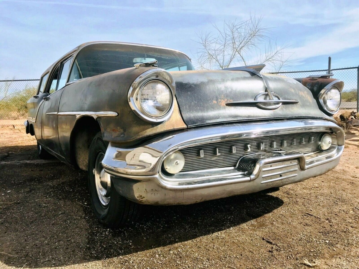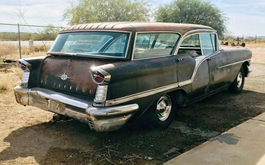 “It’s Fiesta time!” according to Oldsmobile’s 1957 sales literature. This 1957 Oldsmobile Super 88 Fiesta in Tucson, Arizona strikes a serious look with its fish mouth and OLDSMOBILE block-script. Highlights include acres of bright trim, mostly in good shape, dealer-installed air conditioning, and most interesting, a J2 triple two-barrel induction on top of the 371 cid T-400 engine. The hardtop wagon gives an open greenhouse. While it needs some lower metal repair, the desert climate has left this vehicle in highly salvagable condition. The listing here on eBay has enticed at least 12 bidders to drive the market value of this rare heavy hitter beyond $5000, not high enough to meet the seller’s Reserve.