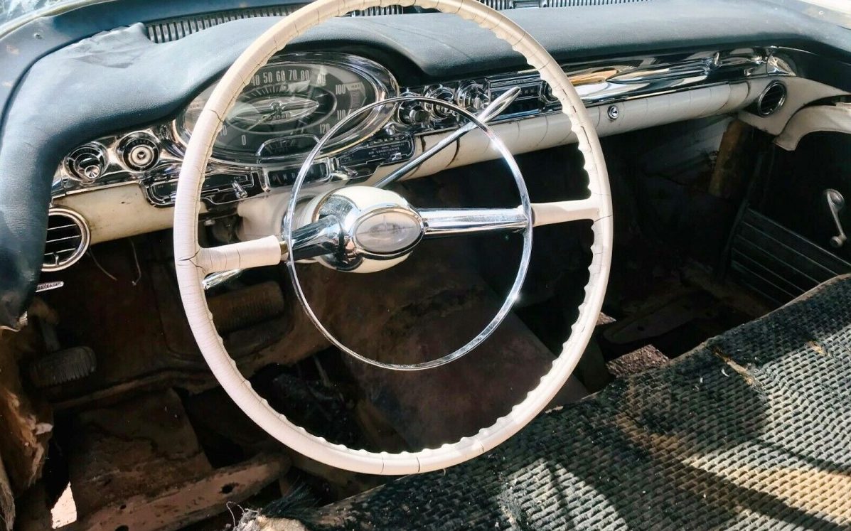 Compared to its iconic Chevrolet cousin, the ’57 Oldsmobile comes off as less sporty, with a more substantial presence. Chrome roof ribs compliment a host of usually two-tone paint jobs, but the seller claims this one wears original black. If it weren’t for the giant dent in the bumper it might only need a good polish. Dual exhaust exits through stylish bumper vents.