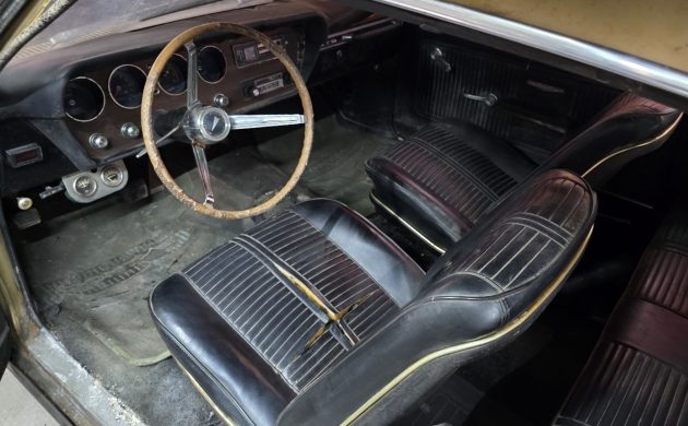 Most of the interior appears to be circa 1966 GTO, but the shifter took the same route as the transmission when that component was removed. To be unrestored, the interior doesn’t look all that bad overall, and I’m guessing the buckets may still be structurally sound enough to just recover. A new dash pad will be needed, along with a restoration of the instrument cluster, but perhaps the gauges will clean up well enough to be saved.