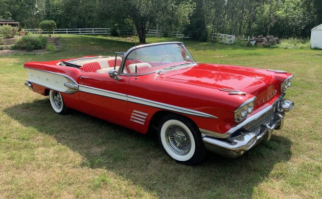 Bonneville production in 1958 was limited to 9,144 coupes and 3,096 drop-tops for 12,240 units in total. Sales figures for the Tri-Power aren’t known, but probably not as rare as the roughly 400 fuel-injected 370s thought to have been built. We assume this big Poncho has a story, but the seller either doesn’t know it or shares it. It seems to be in original condition with perhaps 100,000 miles to its credit. An automatic transmission is part of the package. With the Tri-Power being a big selling point, the seller neglects to pop the hood for a pic or two.
