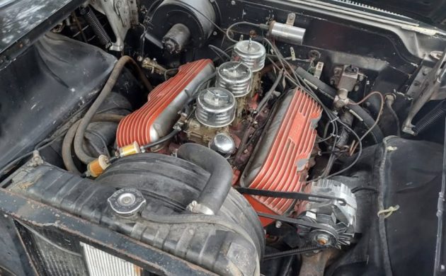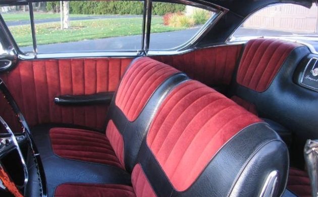 The seller’s Impala Sport Coupe is one of 125,000 built in 1958 and has the 280 hp version of the new 348 V8 (numbers matching?). Since it has an automatic transmission, would that be the 2-speed Powerglide? Back in the day, a prior owner did some customizing by lowering the ride and “hot rodding” the upholstery, but may have left the drivetrain alone. The black paint looks okay from 20 feet, but is cracked and peeling, and needs to be redone.