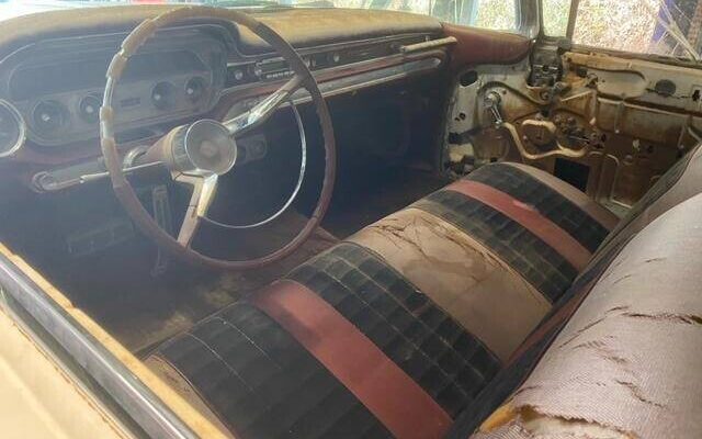 These looked like exceedingly long, low cars because they were – 124″ in wheelbase, 221″ in overall length, 80″ of wide track width, and 54″ in height. This Bonneville is obviously afflicted with surface rust but the body appears to be sound – the seller claims that it has been in dry storage for “decades”. The trim is complete and the chrome plating still reveals a luster. The images are a bit stilted but I can’t find obvious signs of rust-through or crash damage.