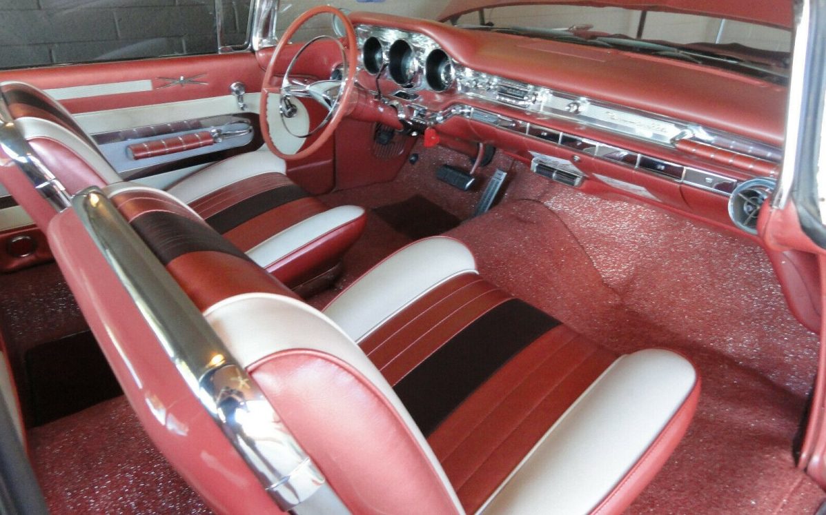 Bonneville was the top zoot-suit Pontiac in 1959 and it made hay advertising its new “wide-track” stance that claimed an additional five inches between the front wheels vs. the previous model year. With the condition referred to as “excellent” by the seller, he further states that this is “One of the most highly optioned 59 Pontiacs you will ever see” and it is still wearing its original “Sunset Glow” body hue topped with a “Cameo Ivory” roof. It certainly looks quite fine but it has a lot going on visually considering the amount of stainless trim and the gewgaws affixed to the quarters. On a subjective note, I’d remove the fender skirts but that’s just me. Rounding out the ’59 era presentation overload are the spinner wheel covers and wide-white wall tires.