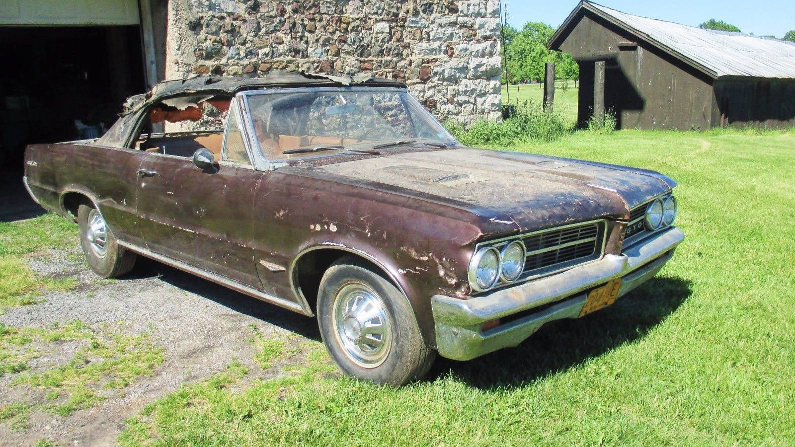 Cool find. I own a 64 gto post coupe. The auto trans takes down the value a bit but covert top balances it out. Top price in #1 condition for this config is about $40k. To have all the work done by a shop will be at least $30k $35k. Add on tri power is cool, but since not original will not improve the price. You can get driver quality, verts in great condition for mid $30ks. The nice thing about this car is since it is auto, it was probably not beat on too badly. Put away in the gas crunch and forgotten. Neat.
