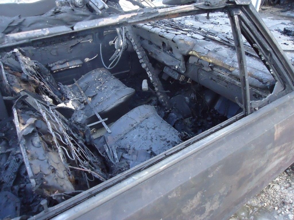 I suspect this car was the victim of what fire inspectors call a “Flash over”, with the fire burning only at the upper areas of the room, hence the tires are still holding air and the engine compartment looks like it only needs minor work compared to the interior. With a flash over situation, cold air is sucked in from the outside and then pulled upwards, keeping the lower areas of the car fairly intact.