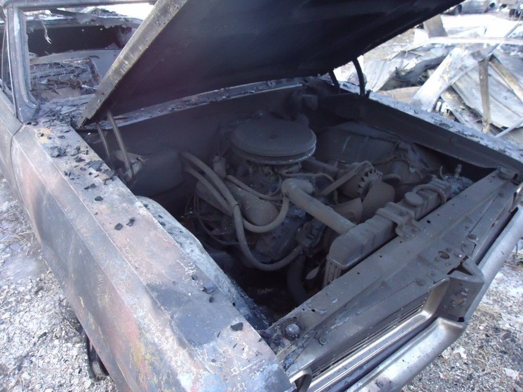 Under the hood lives a 326ci V8 and a 4-speed transmission. Things look pretty dirty under there, but once again, have a good look around. The plug wires are intact, none of the hoses have melted, and even the insulation on the wiring seems to be intact. If the fire had been really intense, I would have expected some, if not all of these items, to have suffered some significant damage. Even if the rest of the car is beyond help, the drive-train has more than likely survived the inferno and should be able to be used again once thoroughly checked.