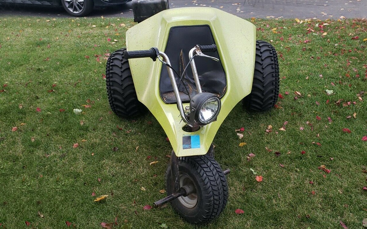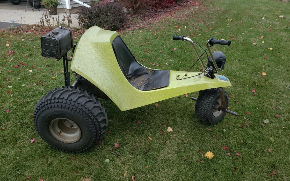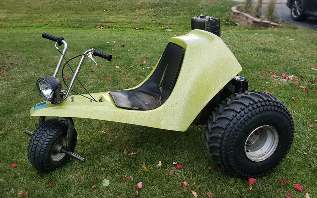I almost forgot, I had a Tri sport also! Similar to this one but way more refined. 440 air cooled twin, front and rear suspension. that one ran like a raped ape. My buddy had one with a 14hp McCullough 2cycle, that thig was lighter than mine and it FLEW! It’s a wonder we didnt get hurt on those two.You could get them with turn signal, hi low headlights and brake lights and drive them on the road.