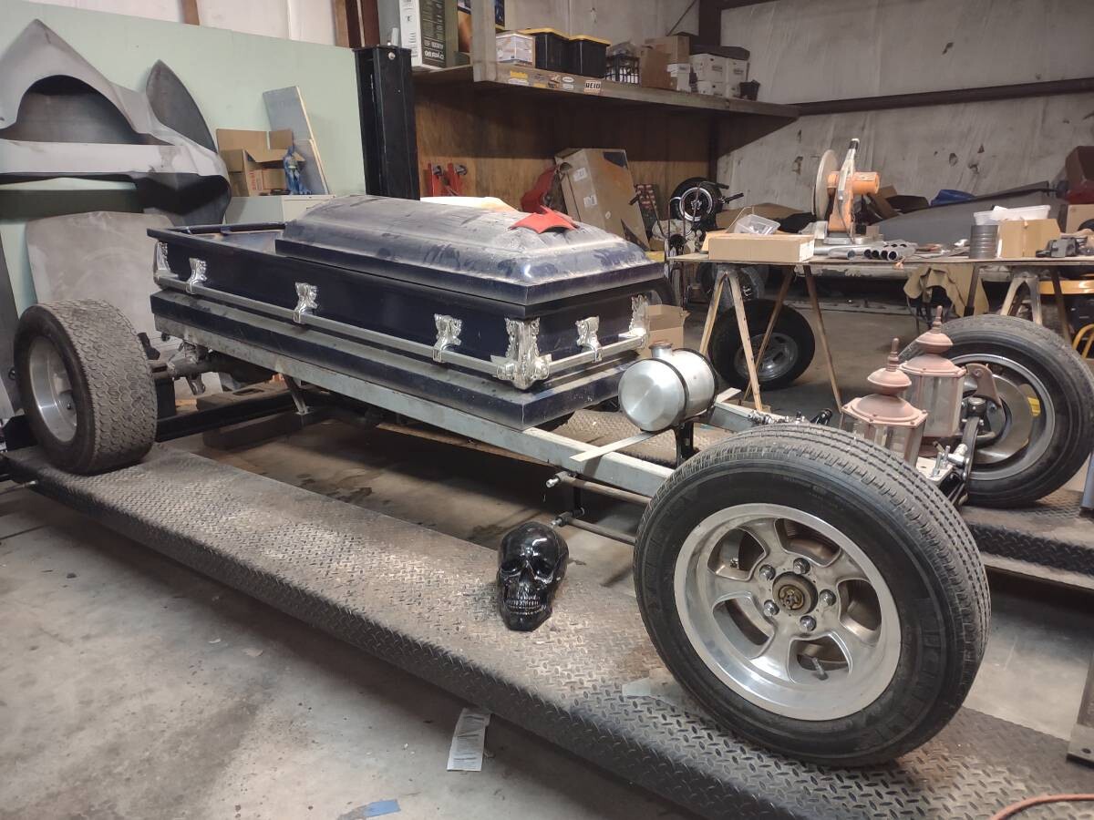 Wow, this is hardly Dragula anything , other than its a coffin on a frame, but that’s about where the similarities end. Even if this was finished, it still wouldn’t even be close- Kind of like saying the 74 Mustang II was a tribute to the 65 Mustang – at first glance it looks a bit like the original ,but the more you look ,you see its nothing like the original . ( and yes, I like both Mustang versions )