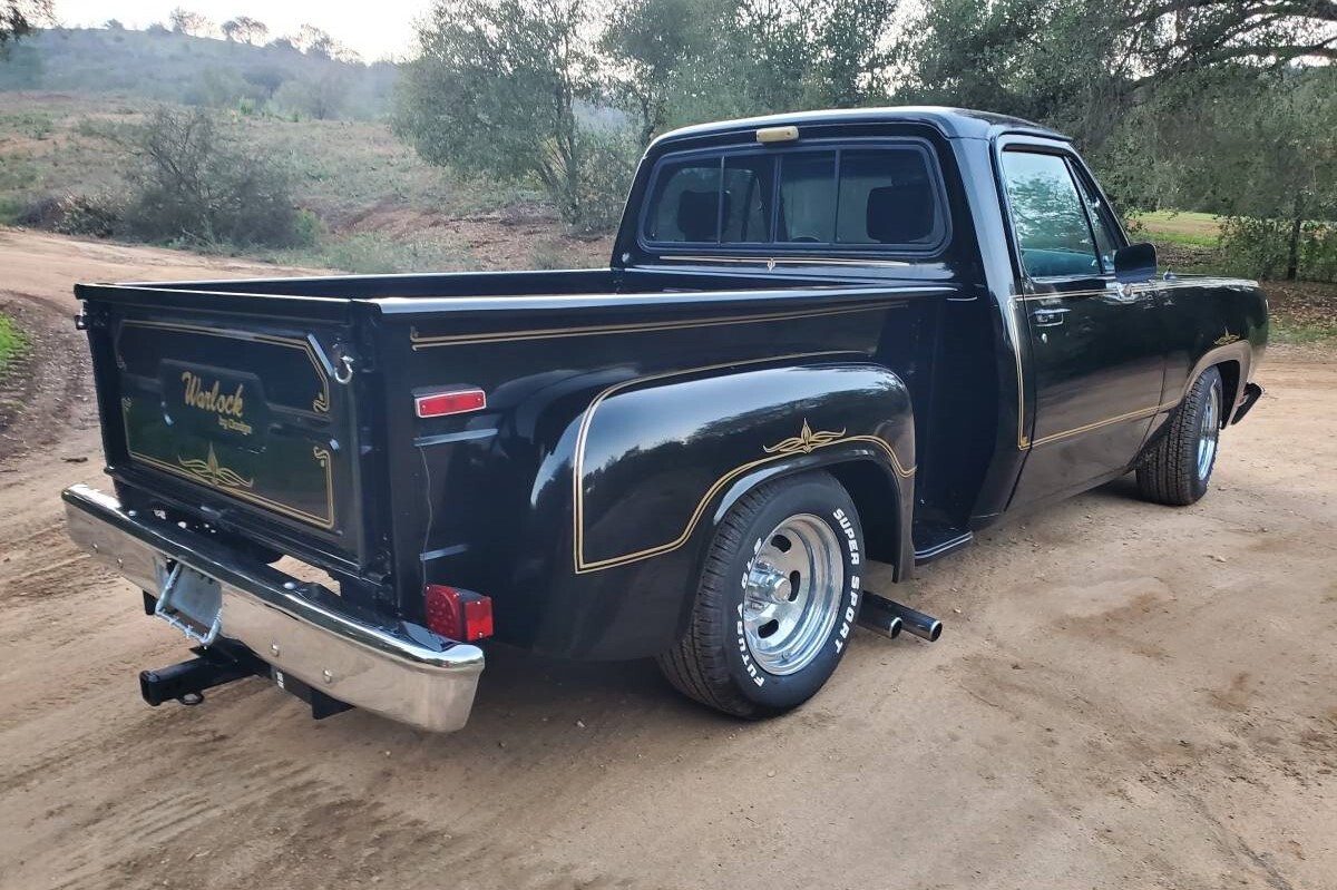 Visual cues of the Warlock consisted of custom gold wheels, wide tires, bucket seats, and a Utiline bed with oak racks. All Warlocks had black interiors, with gold accents on the dash and the doors, and a “tuff” steering wheel. The exterior was accented by gold pin striping around the wheel wells and the body lines. The pin striping continued inside onto the doors, dashboard, and instrument panel. The seller’s ’78 Warlock looks to have stayed somewhat stock, but the wheels look to be different, and the engine wears more bling than I thought came with the package. And the side exhaust looks to be custom.