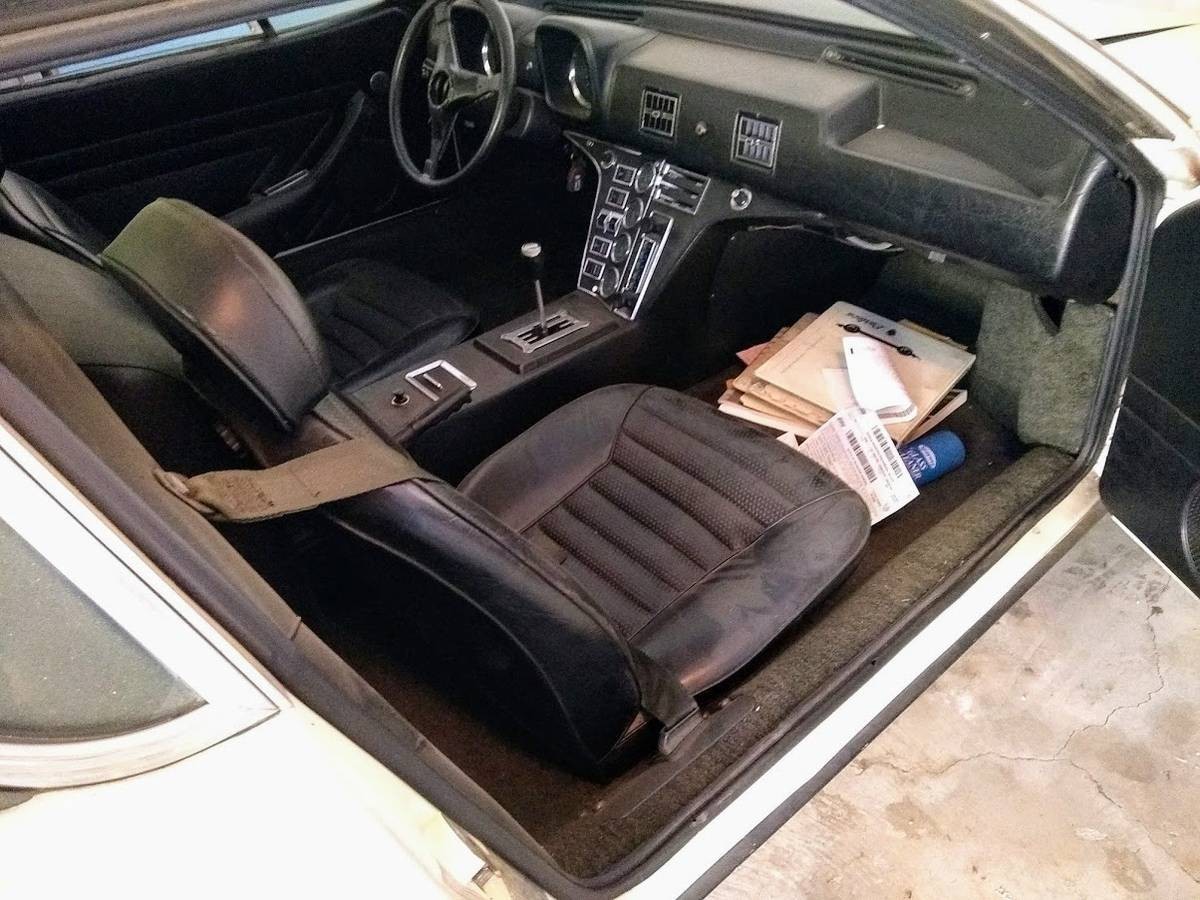 Here is the interior of the while 1972 Pantera. The car has apparently been sitting for about 20 years and looks nice, just dusty. The car has its original white paint and steel Group 4 fender flares that are primered. The odometer shows just 31,900 miles and is equipped with a 351 cubic inch V8 engine backed by a 5-speed manual transmission. The Pantera had Webber carburetors on it but were removed at some point and a Holley 4 barrel carburetor was installed for driveability purposes. The Webber set up comes with the sale of the car. The rear wheels and tires are huge.